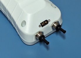 An der Unterseite befinden sich zwei 6mm Schlauchanschlüsse und auf der Rückseite ein XT60 Stecker für den Akku. Seitlich am Gehäuse ist noch eine MR30 Buchse für den Anschluss des FuelSwitch.