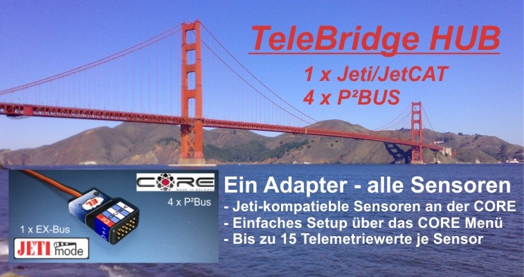 Die TeleBridge übersetzt die Sensorwerte von Jeti-kompatieblen Sensoren in das P²-Bus Protokoll der CORE. So können die vorhandenen Sensoren ganz einfach an der CORE weiter genutzt werden.